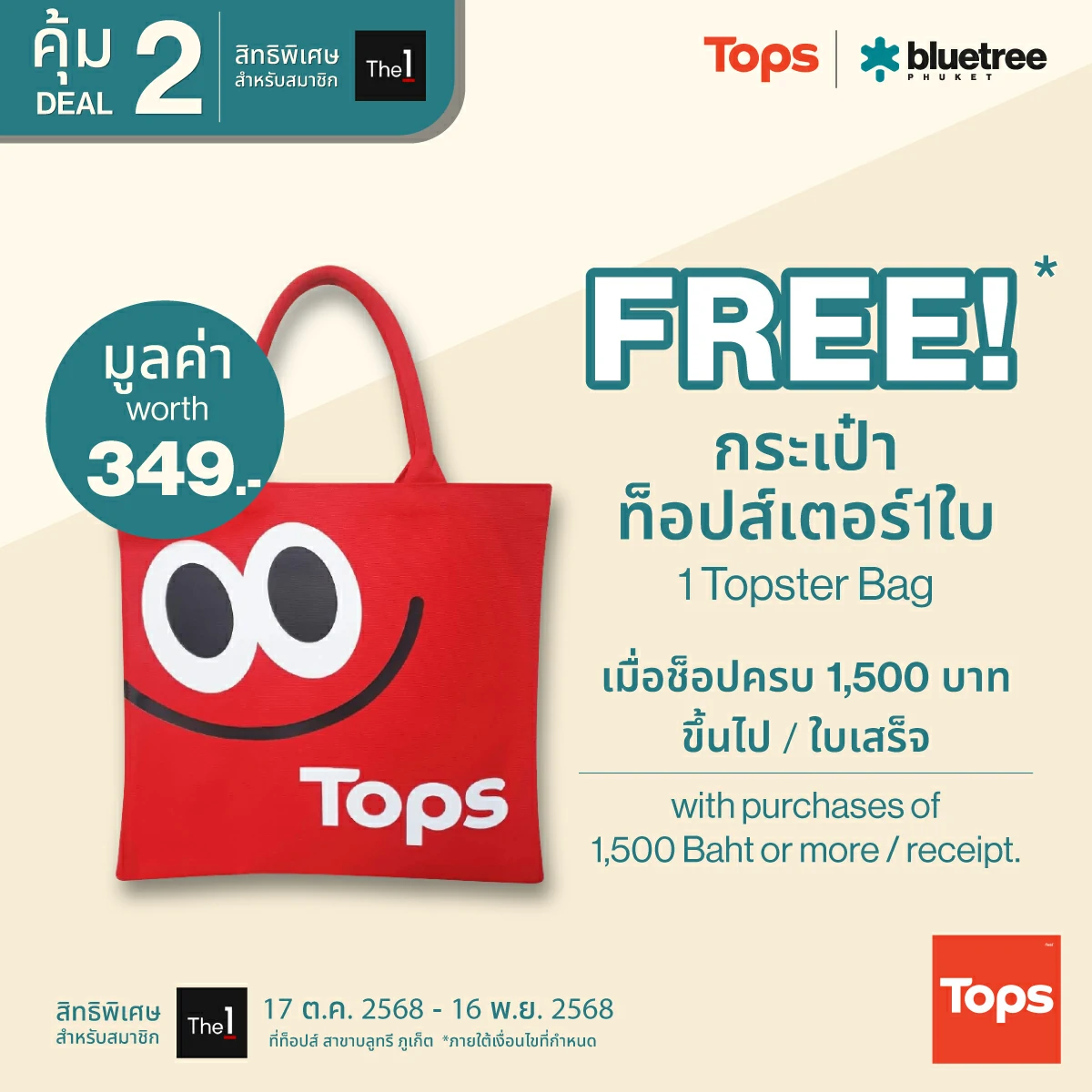 Get ready The 1 members. Tops is serving you the ultimate shopping reward with the exclusive “Kum Deal 2” promotion. Every 1,500 THB spent per receipt instantly earns you a trendy Topster Bag worth 349 THB. Bold red, super cute logo, and the perfect size for every day. Shopping trips, beach days, café hopping, gifting someone you love… this bag makes every moment look better.